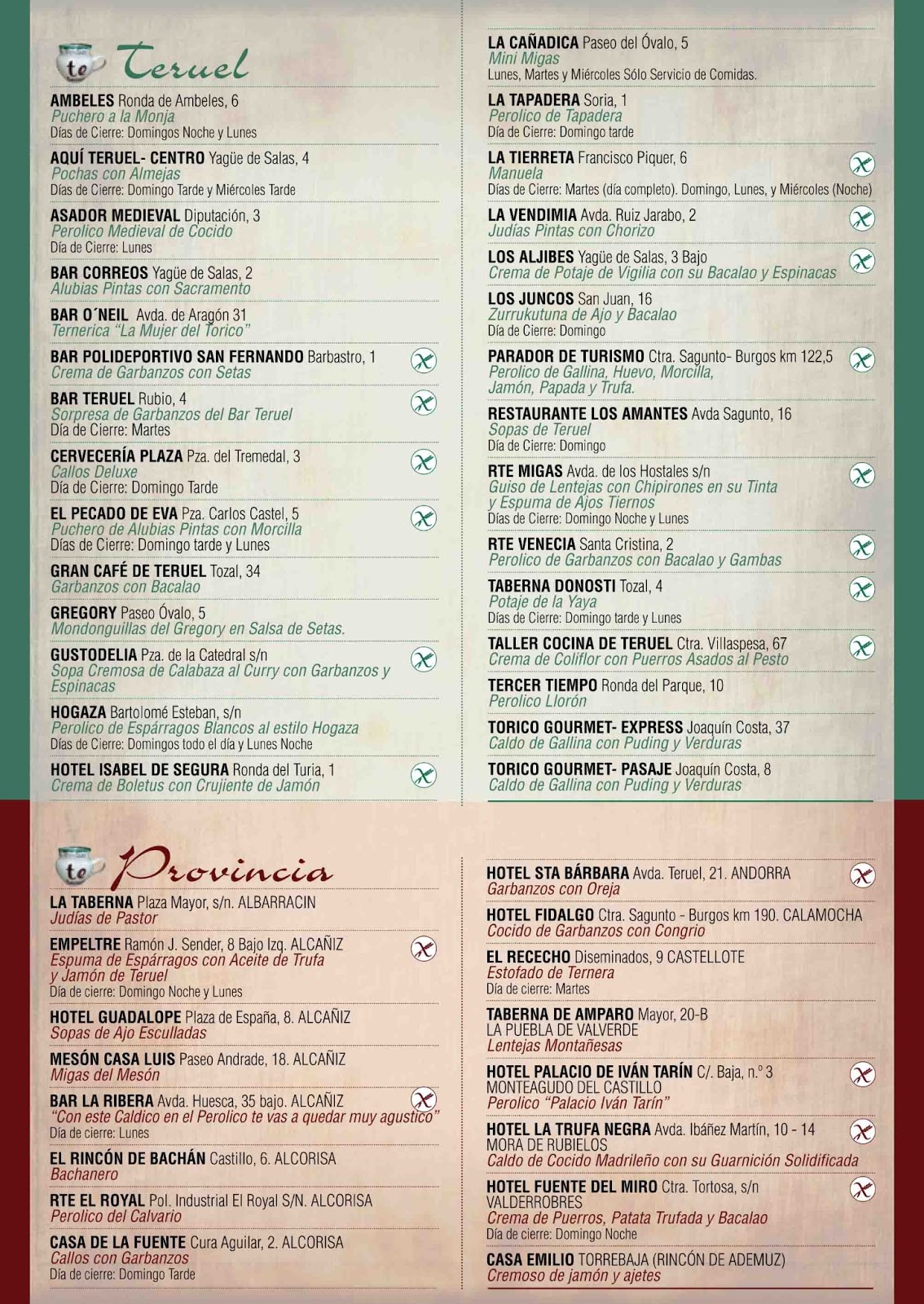 Del 24 de enero al 10 de febrero, se celebrará la IV Ruta del perolico de Teruel, que permitirá disfrutar de la cocina de cuchara en numerosos bares y restaurantes de la provincia. Por 2,5 euros, la tapa en perolico y una copa de ino Dos Tierras 2010; y un eiro cada perolico más.