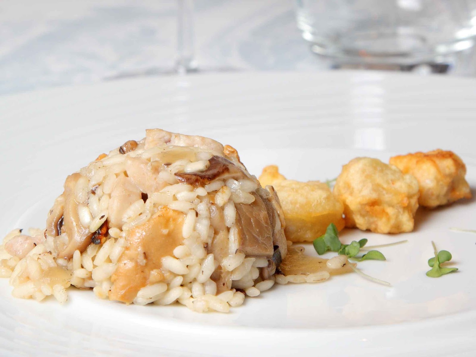 Rabo de toro enrollado con una fina lámina de vino tinto de Corona de Aragón y salsa de hongos.