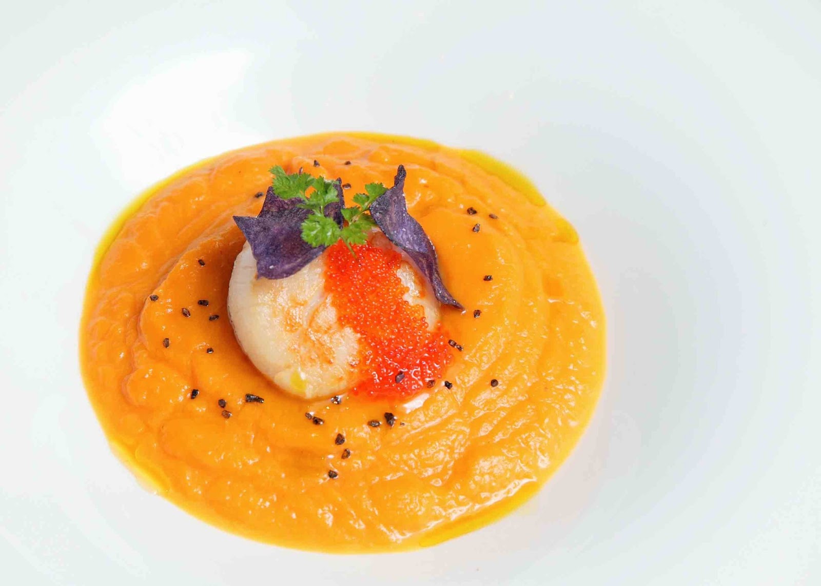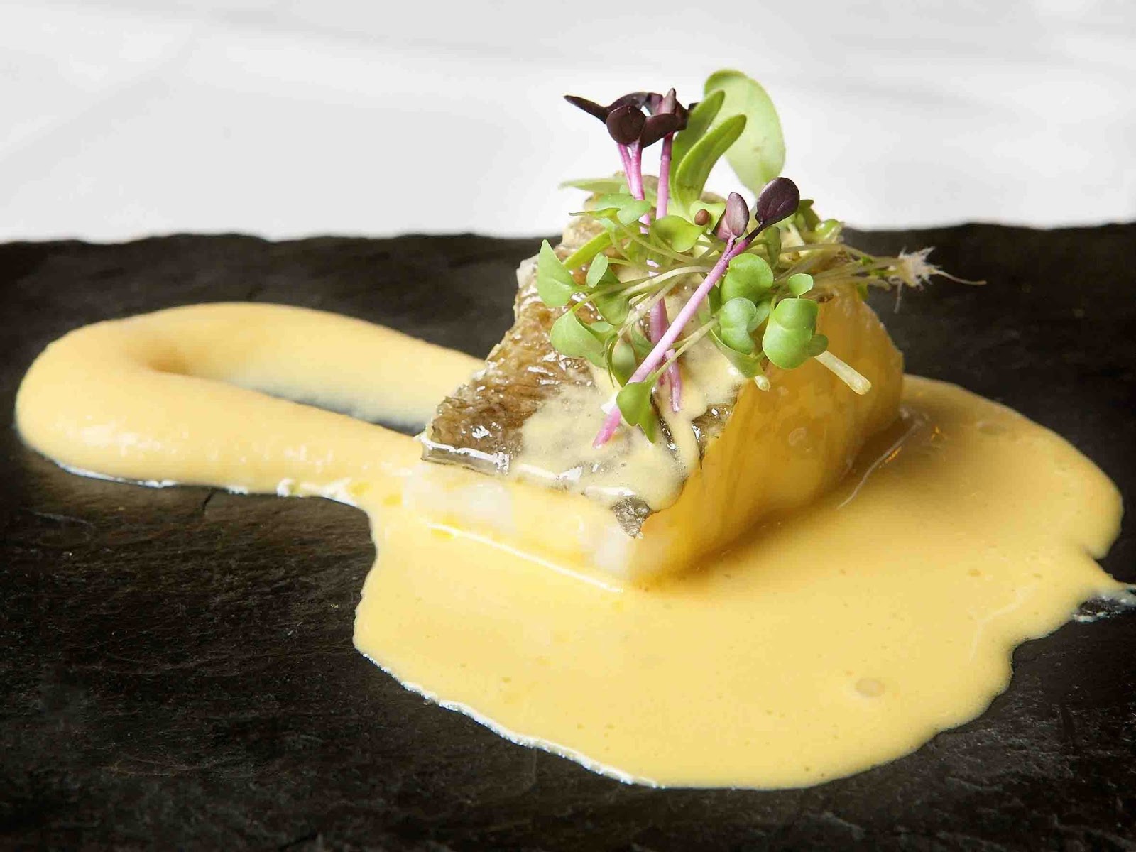 Dorada con tarta de cebolla caramelizada y puré de calabaza violina.