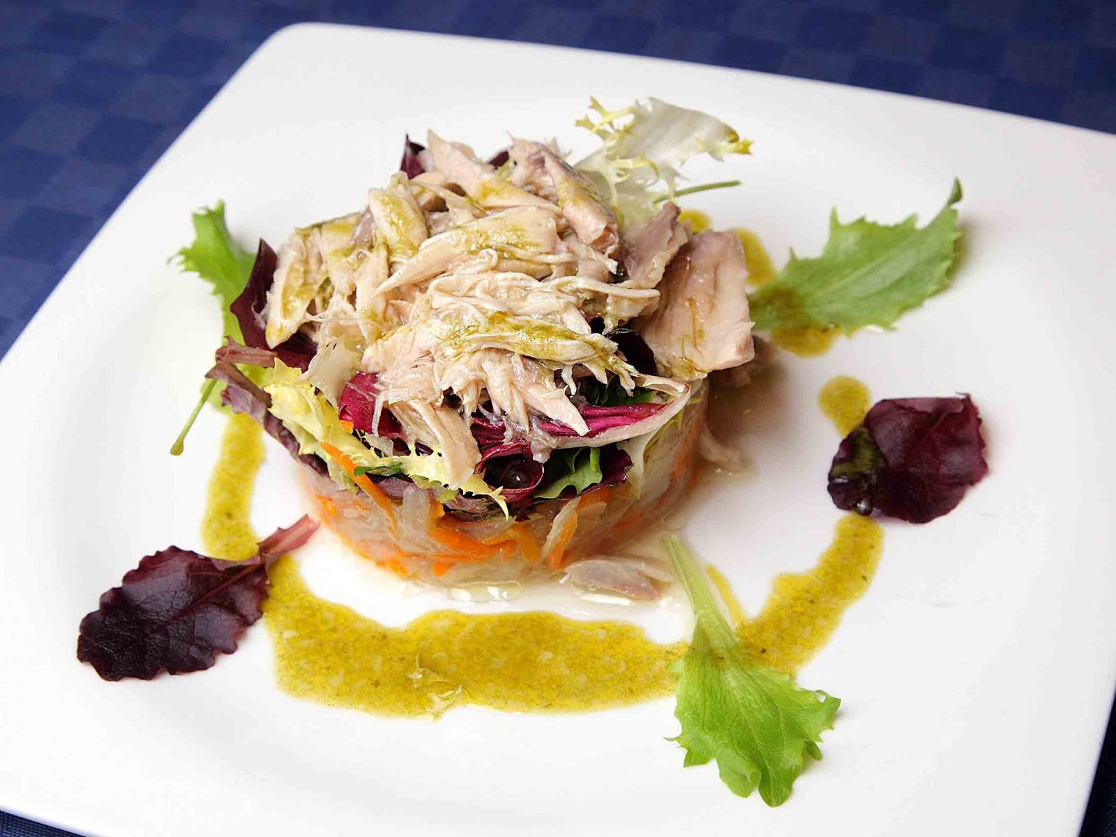 Ensalada de tallos tiernos con queso de cabra y bonito.