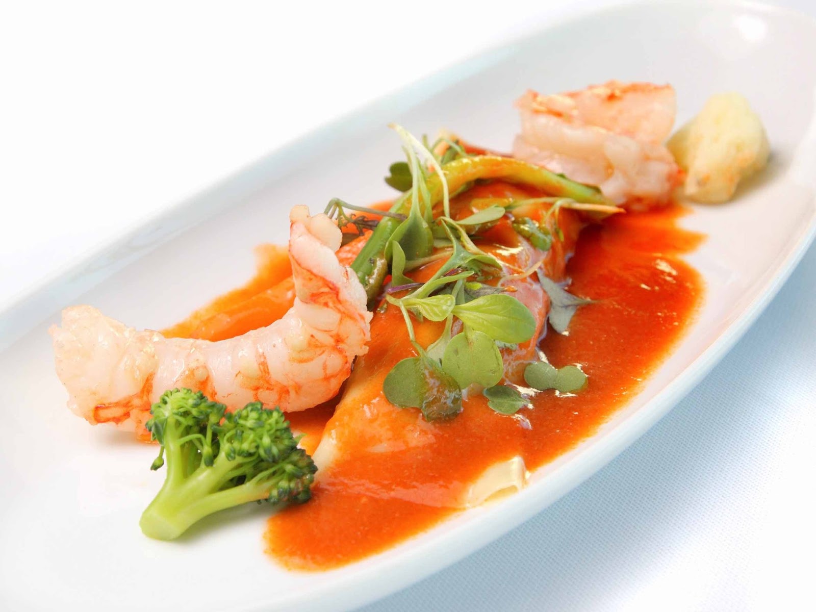 Para compartir: Carpaccio de champiñones y virutas de jamón; Ensalada de invierno; y Langostinos a la naranja.