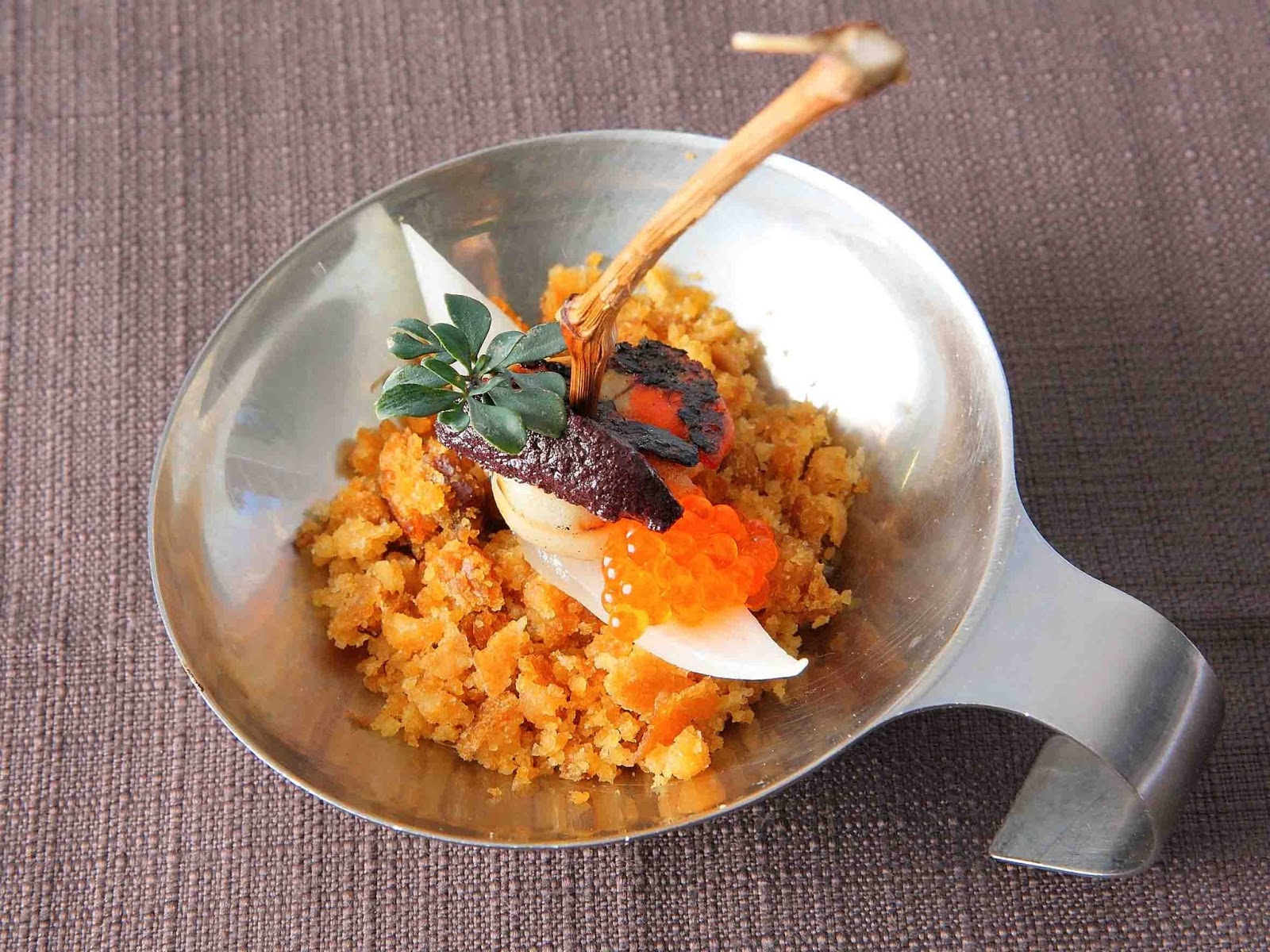 Aperitivos: Galleta de foie y manzana; Nuestra salmuera del Cantábrico en tako; Torrezno de langostino al cerezo; Plata de migas light con vieira y tapenade de Aragón; Chiquito de brandada de bacalao.