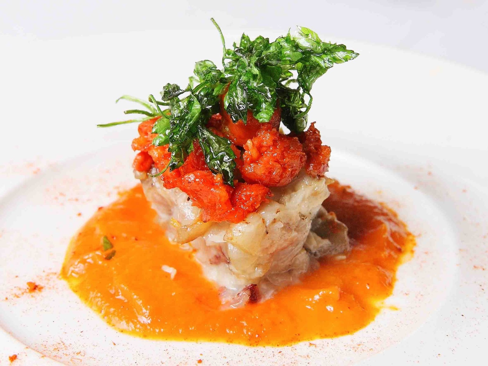Borrajas en dos texturas con langostino ibérico, aceite de cúrcuma y crespillos salados / Corona de Aragón macabeo Chardonnay.