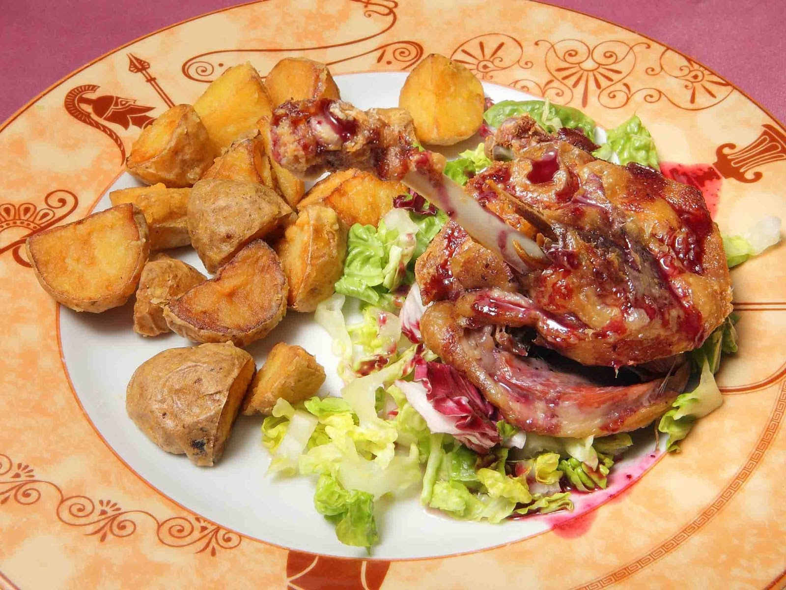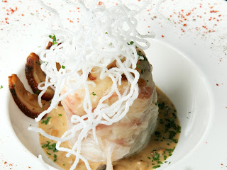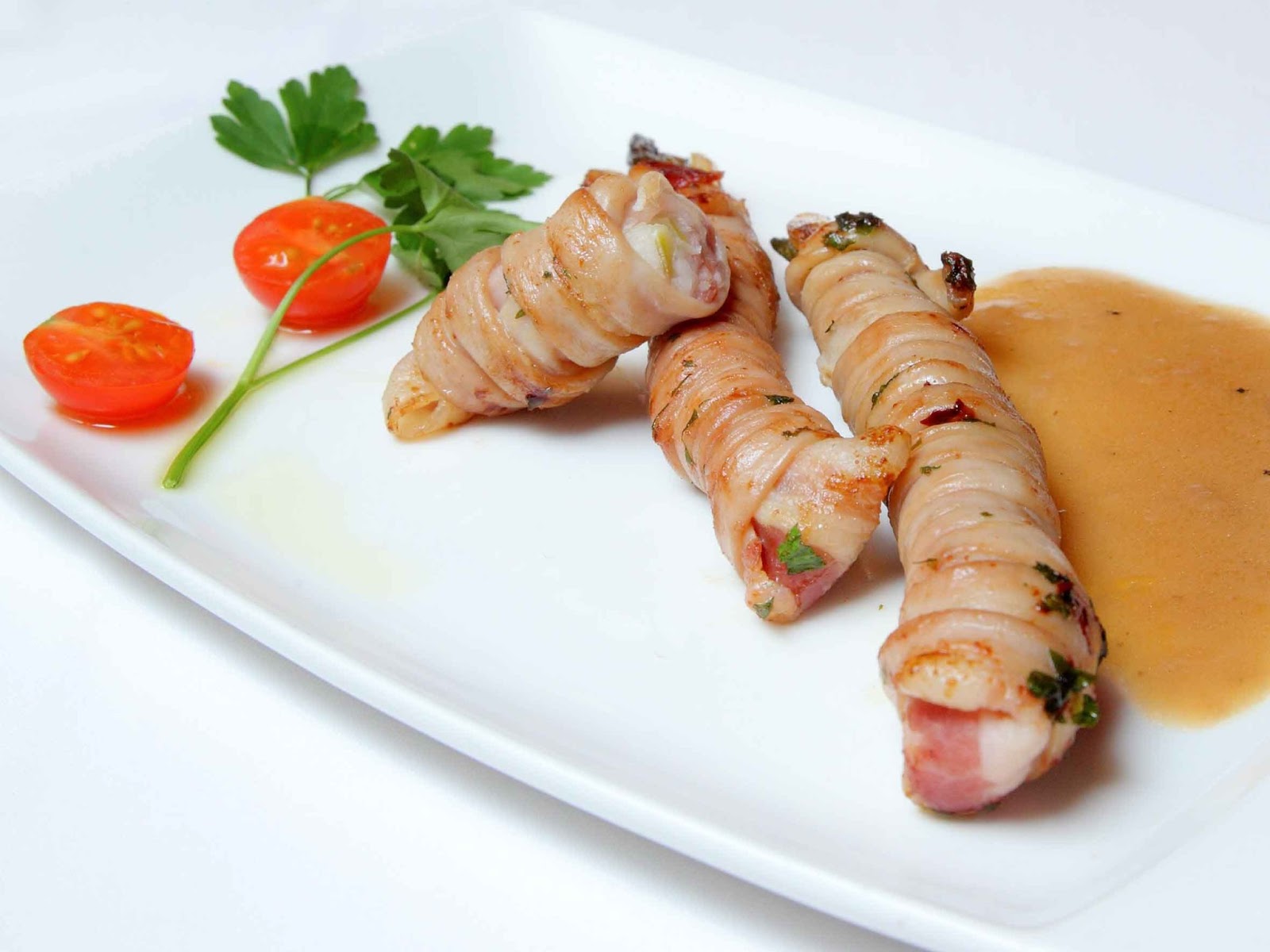 Madejas rellenas de panceta crujiente en reducción de brandy.