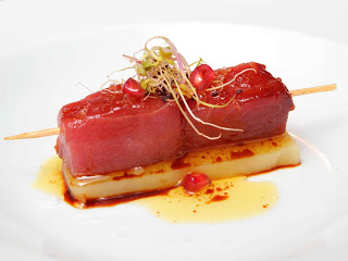 Brocheta de atún rojo marinado con membrillo de manzana verde y apio.