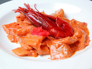 Entrantes: Carpaccio de langostinos con kikos, al pilpil de calabaza amarilla; y Cilindrín de boletus con torta de patata.