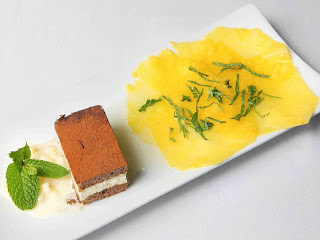 Lasaña de piña caramelizada con cristal de limón y jugo gelatinizado y helado.