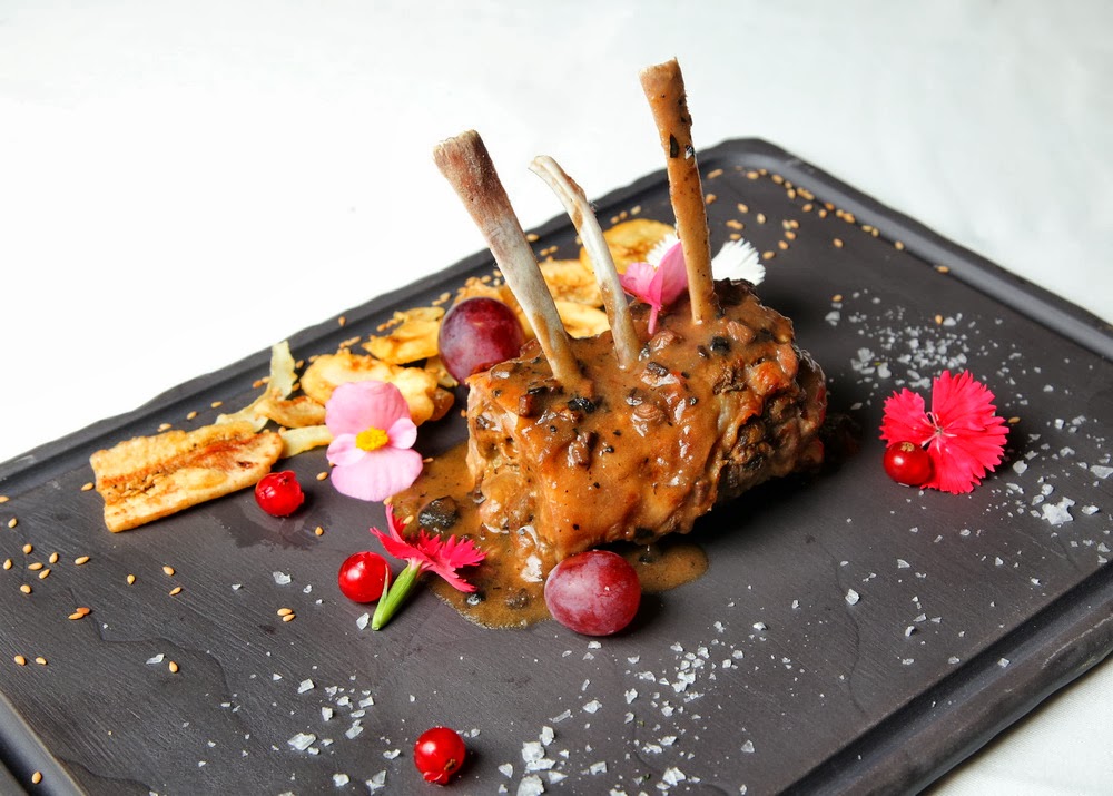 Costillar de Ternasco de Aragón IGP relleno de frutos de otoño y salsa de moras.