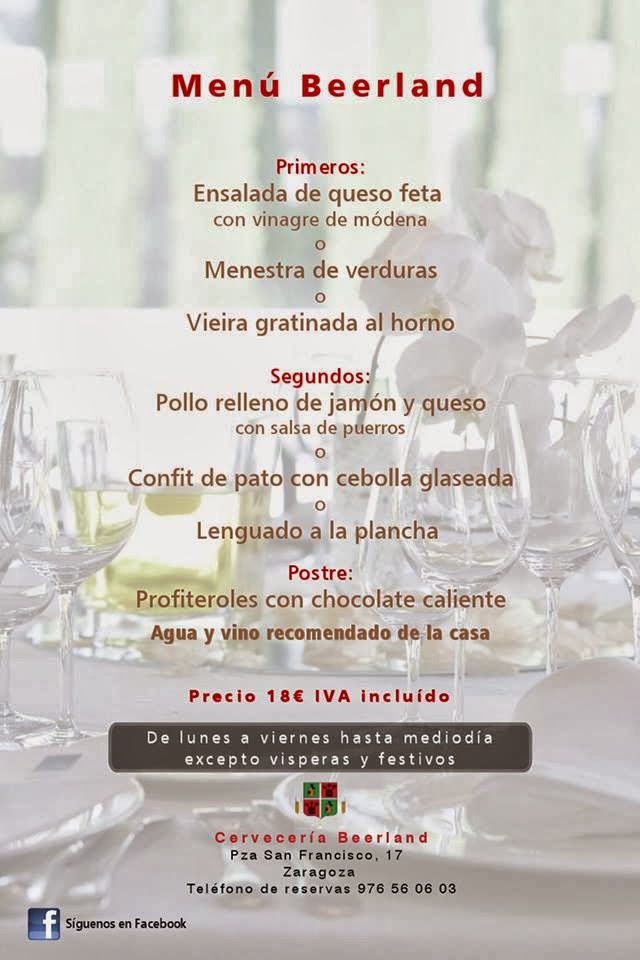 La Cervecería Beerland −Pl. San Francisco, 17. Zaragoza. 976 560 603− ofrece su nuevo menú semanal, de martes a viernes, excepto festivos, por 18 euros. Incluye tres servicios, vino y agua.