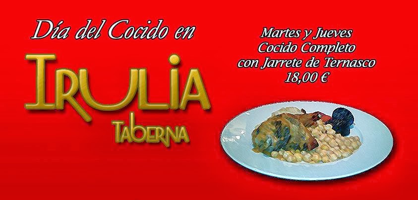 Aprovechando que se acercan las fechas invernales, todos los martes y jueves, por 18 euros, menú especial con nuestro particular Cocido con jarrete de ternasco, en la Taberna Irulia −Teniente Coronel Valenzuela, 13, (plaza Salamero). Zaragoza. 976 235 838−, además de su menú diario por 13,50 euros.