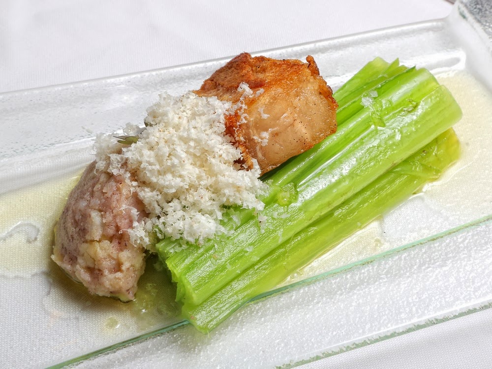 Borraja, patata trufada, papada, serrín de nuez de macadamia y aceite de oliva virgen verdeña.