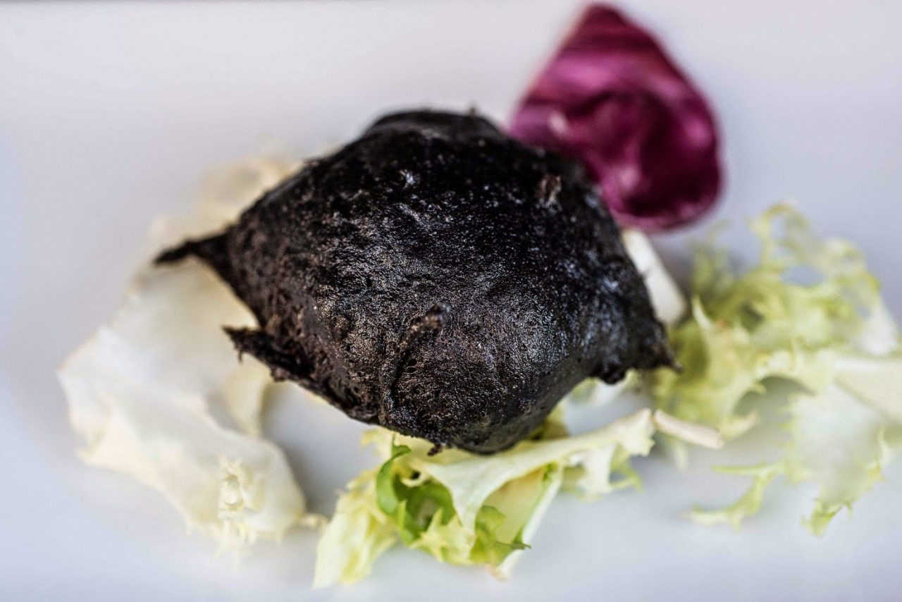 Montadito de pan de naranja con bacalao ahumado y aceituna negra