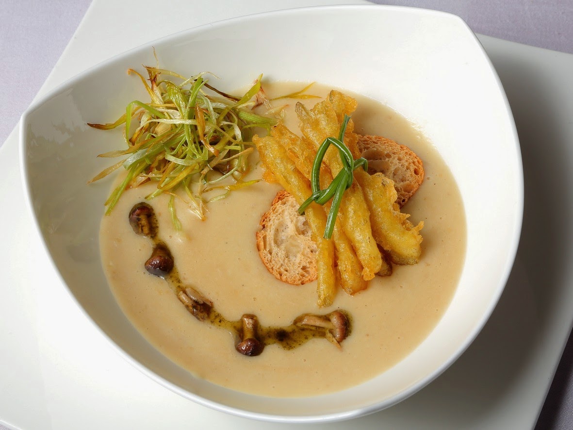 Crema de hongos del monte turolense, ternera del Pirineo, foie de Santa Eulalia, aceite de trufa de Sarrión.