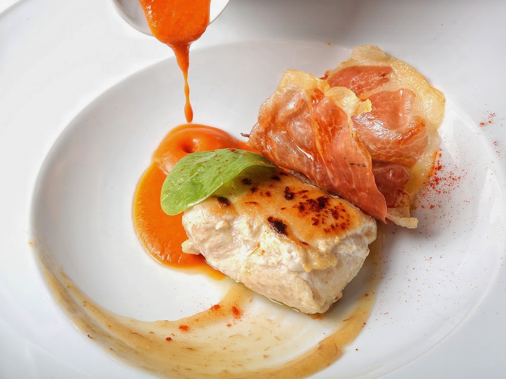 Ravioli de magret de pollo y queso Nube de Fonz con jugo de chilindrón y teja de jamón.