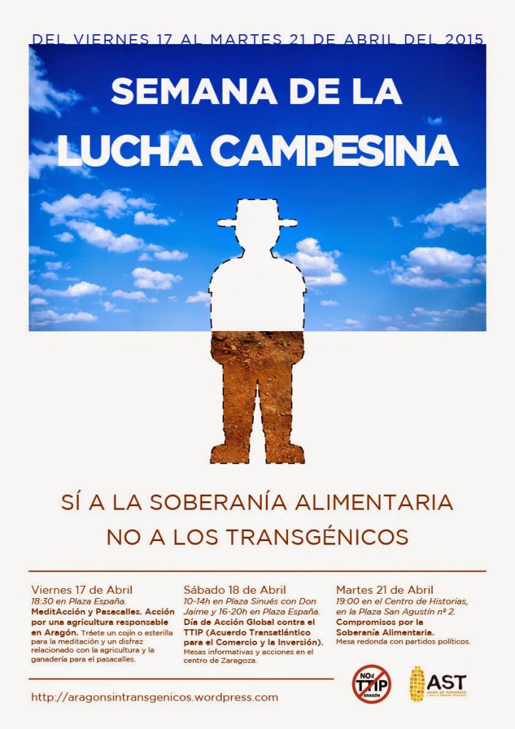 VIERNES 17 DE ABRIL. Día Internacional de la Lucha Campesina. Acción para una Agricultura Responsable en Aragón. En la Plaza España a las 18.30 horas, MEDITACCIÓN colectiva por una agricultura consciente y responsable. A las 19.30 PASACALLES en defensa de nuestro derecho a la Soberanía Alimentaria y un Aragón libre de Transgénicos. «Para la meditAcción te puedes traer un cojín o esterilla y para el pasacalles te animamos a disfrazarte de algo relacionado con la agricultura y ganadería»