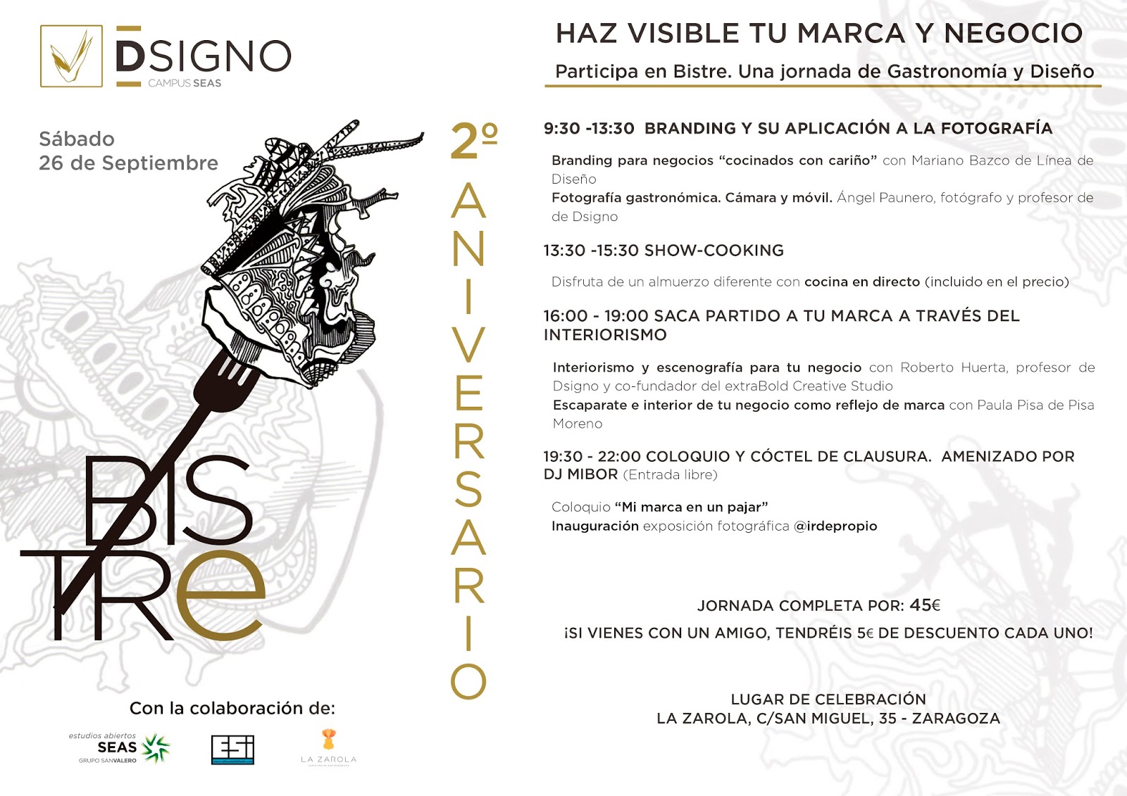 El sábado, 26, cita con el diseño en BISTRE, que unirá gastronomía y diseño para celebrar el 2º aniversario de Dsigno. Con una sesión formativa en La Zarola −San Miguel, 35. Zaragoza. 661 668 471−, a través de numerosos profesionales y especialistas del sector. Se aprenderá a destacar nuestro negocio y a vender nuestra marca a través de la fotografía, el interiorismo o el escaparatismo. Con profesionales del Branding, como Mariano Bazco de Línea de Diseño, y de la fotografía gastronómica con cámara y móvil, Ángel Paunero, profesor de Dsigno y fotógrafo.