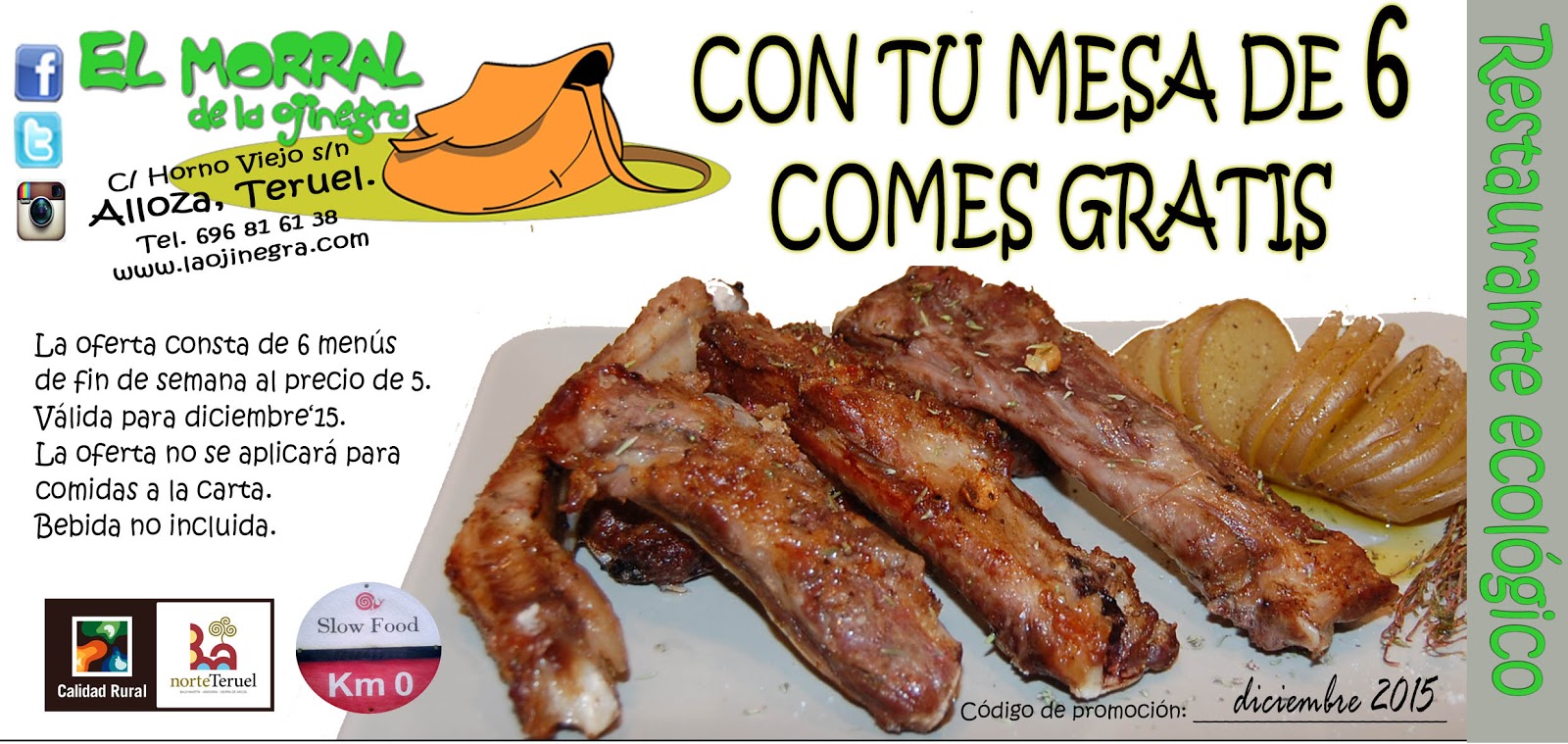 El Restaurante ecológico El Morral de la Ojinegra —Horno viejo, s/n. Alloza. 696 816 138—, ofrecelos fines de semana de diciembre su promoción 5+1, válida para los menús, sin incluir bebida. Van seis y pagan 5