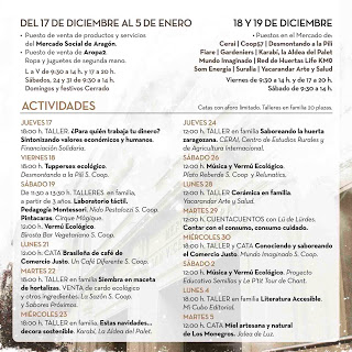 De lunes a viernes, de 9.30 a 14 y de 17 a 20 horas. Los sábados 24 y 31 abrirá de 9.30 a 14 horas. Domingos y festivos permanecerá cerrado. También hasta el 5 de enero se van a celebrar, en horario de mañana y tarde distintas actividades lúdicas, gastronómicas y culturales, desde talleres sobre comercio y economía solidaria a talleres en familia, catas de café o de miel, conciertos, vermús ecológicos, etcétera.