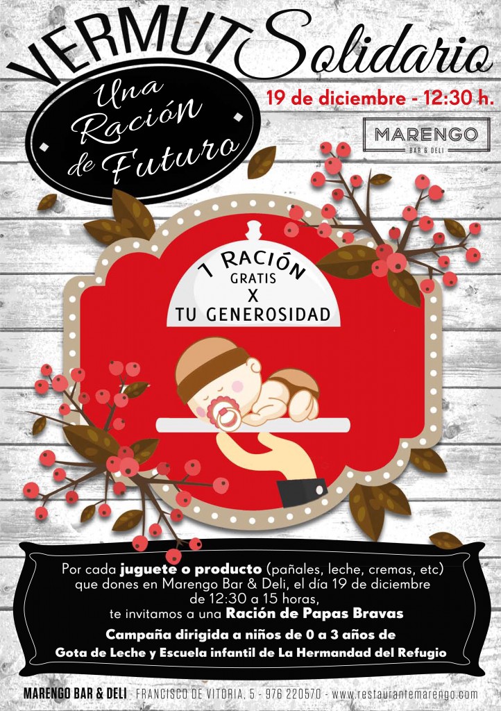 En Marengo Bar & Deli −Francisco Vitoria, 5-7. Zaragoza, 976 220 570− quieren premiar tu generosidad. Por ello, el sábado, 19 de diciembre de 12.30 a 15 horas, por cada juguete o producto (pañales, leche, cremitas, etc.) destinado a niños de 0 a 3 años, que lleves, te regalan una ración de papas bravas.