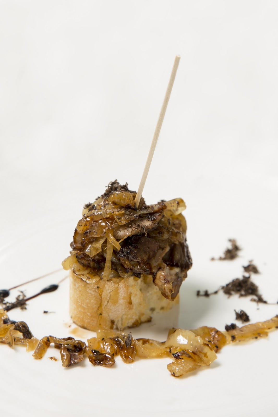 Café L’Arcada. Montadito de láminas de varilla de cerdo al horno con cebolla caramelizada y reducción de Módena trufado.
