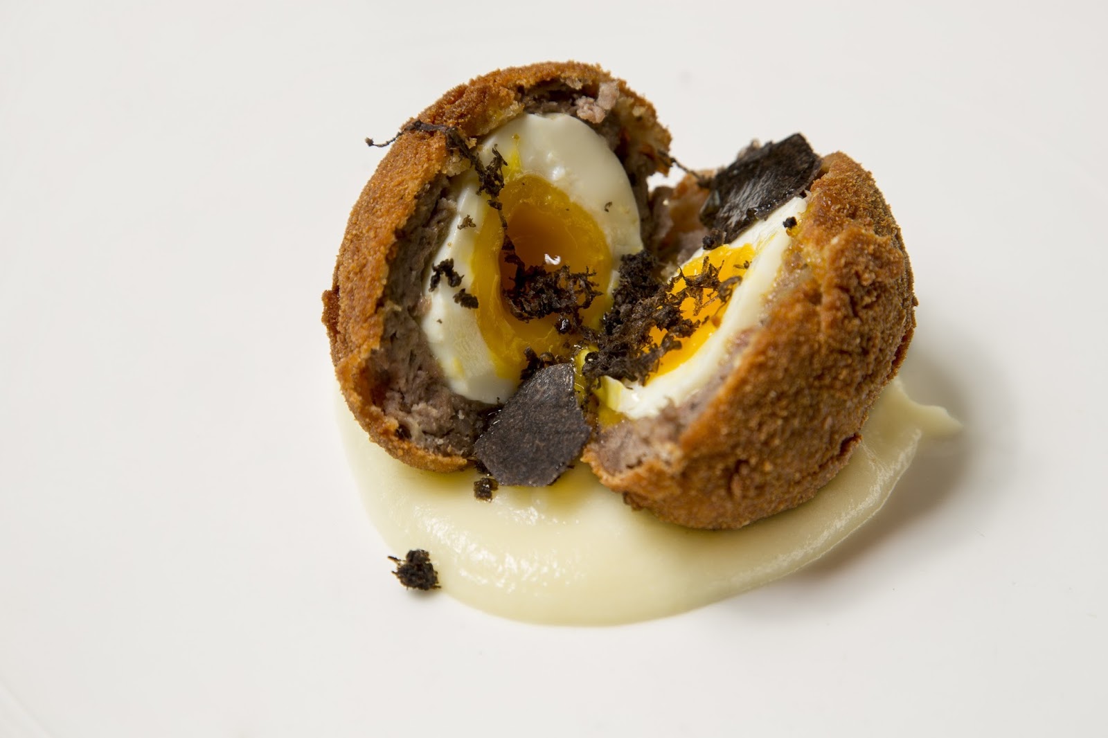 Restaurante Di Marco. Bomba de ternera angus trufada con huevo sobre suave fondo de patata.
