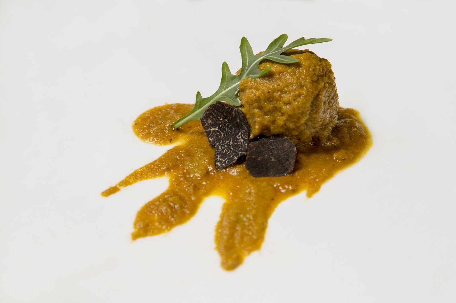 Restaurante mesón La Litera. Albóndiga de bacalao con trufa en baño de pimiento amarillo.