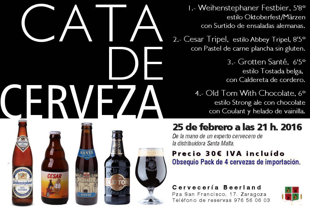 La Cervecería Beerland −Pl. San Francisco, 17. Zaragoza. 976 560 603−, celebra una cata de cervezas, el jueves, 25, a las 21 horas, maridadas con diferentes platos. Por 30 euros, con la presencia de un cervecero de la fistribuidora Santa Malta y obsequio de cuatro cervezas de importación.