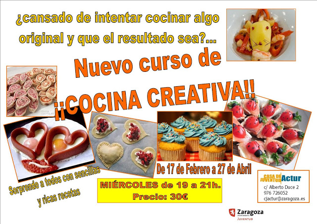 Taller de cocina creativa para jóvenes, para jóvenes de 12 al 30 años, los miércoles, del 17 de febrero al 27 de abril, de 19 a 21 horas, en la Casa de juventud del Actur −Alberto Duce, 2. Zaragoza. 976 726 052−. Por 30 euros.