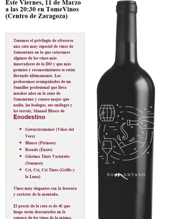 El viernes, 11, a las 20.30 horas, en Tomevinos Palafox −Casa Jiménez, s/n. Zaragoza. 976 961 528−, cata de vinos de Somontano. Por 4 euros, que se descuentan de la compra de vinos de la cata.