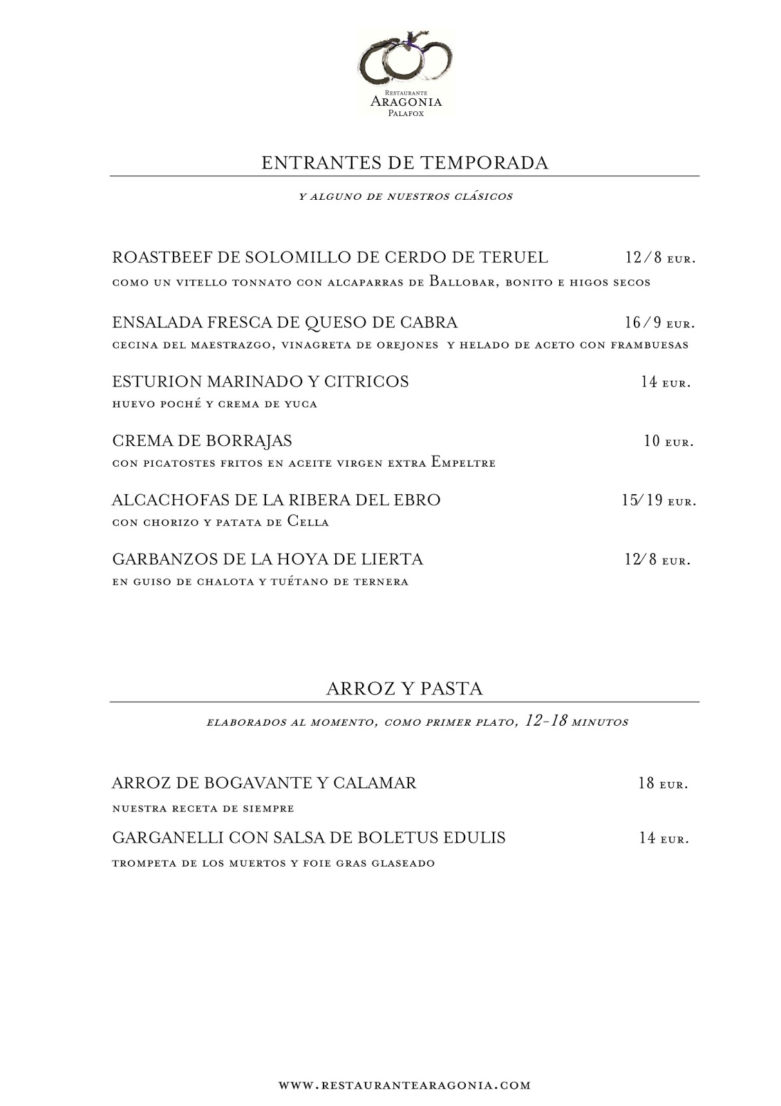 El restaurante Aragonia −Casa Jiménez, s/n. Zaragoza. 976 794 243− estrena nueva carta, manteniendo las características de su cocina. Así, cuenta con: