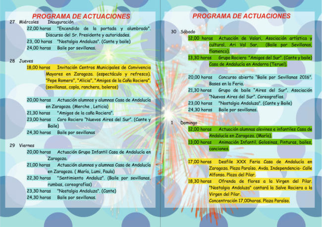 La XXX Feria de Andalucia en Zaragoza se traslada a la Sala multiusos del Auditorio –Pl. Miguel Merino. Zaragoza−, del 27 de abril al 2 de mayo. Entrada libre hasta completar aforo.