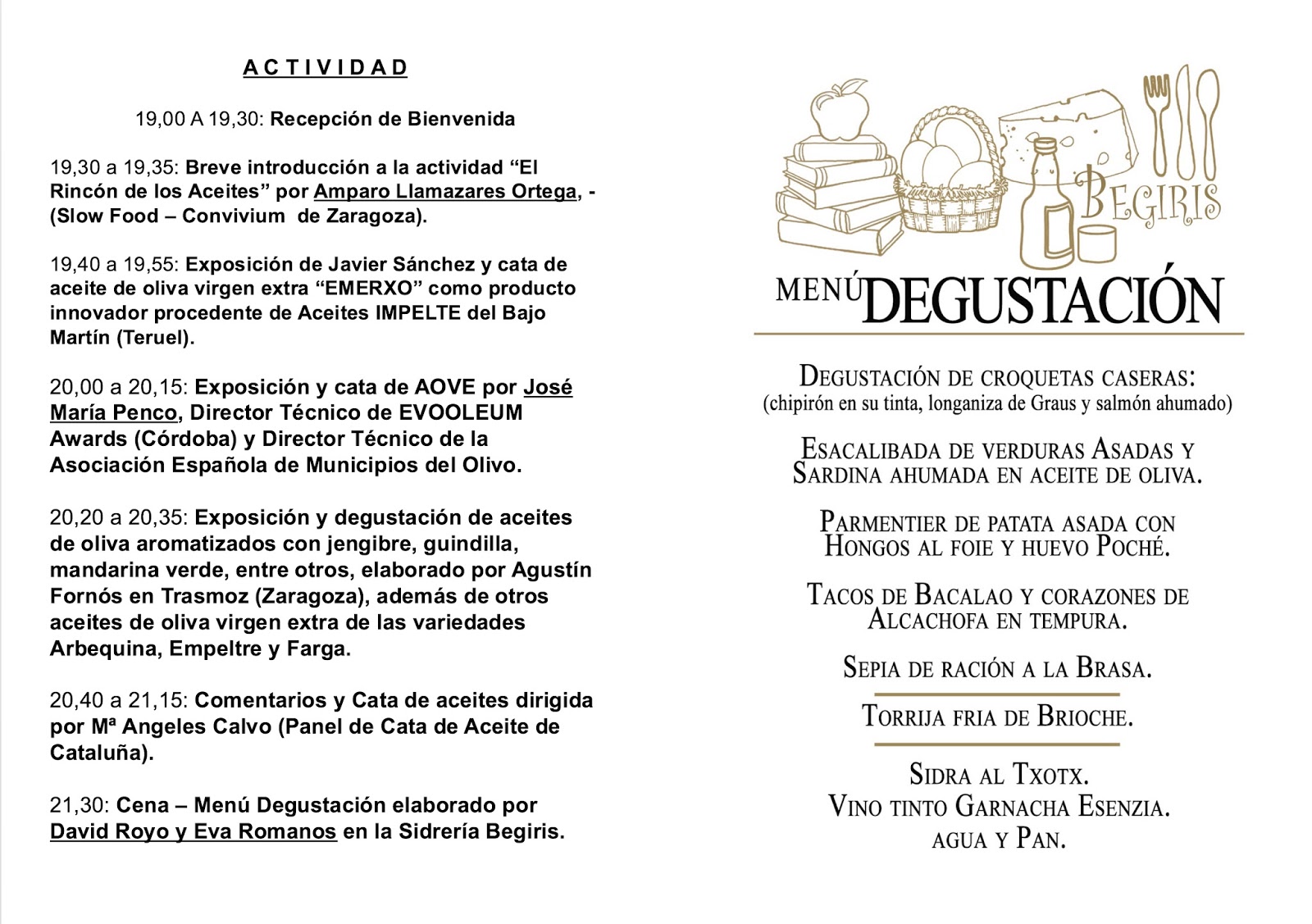 Quinta edición del Rincón de los aceites de España, organizada por Slow Food Zaragoza. A partir de las 19 horas, el martes, 17, Cata de aceites de oliva virgen extra y posterior cena de especialidades a cargo de Eva Romanos y David Royo, propietarios de la sidrería Begiris −Inocencio Ruíz Lasala, 52. Zaragoza. 691 660 055−, donde se celebrará el evento.