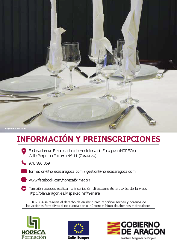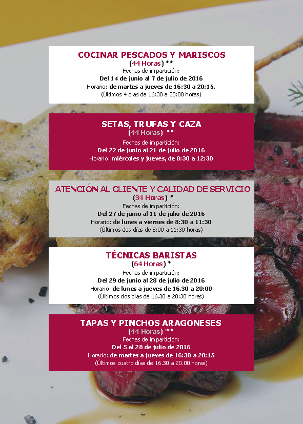 Del 5 al 28 de julio, y de martes a jueves, de 16.30 a 20.15 horas (últimos dos días hasta las 20 horas), nuevo curso gratuito de 44 horas en tapas y pinchos aragoneses. En Horeca Formación –Perpetuo Socorro, 11. Zaragoza. 976 386 069–, dirigidos prioritariamente a trabajadores de hostelería.