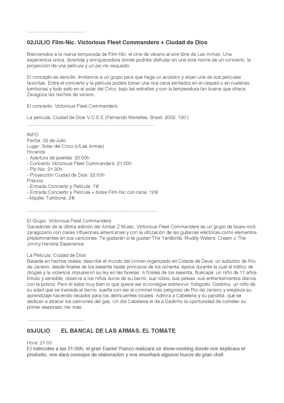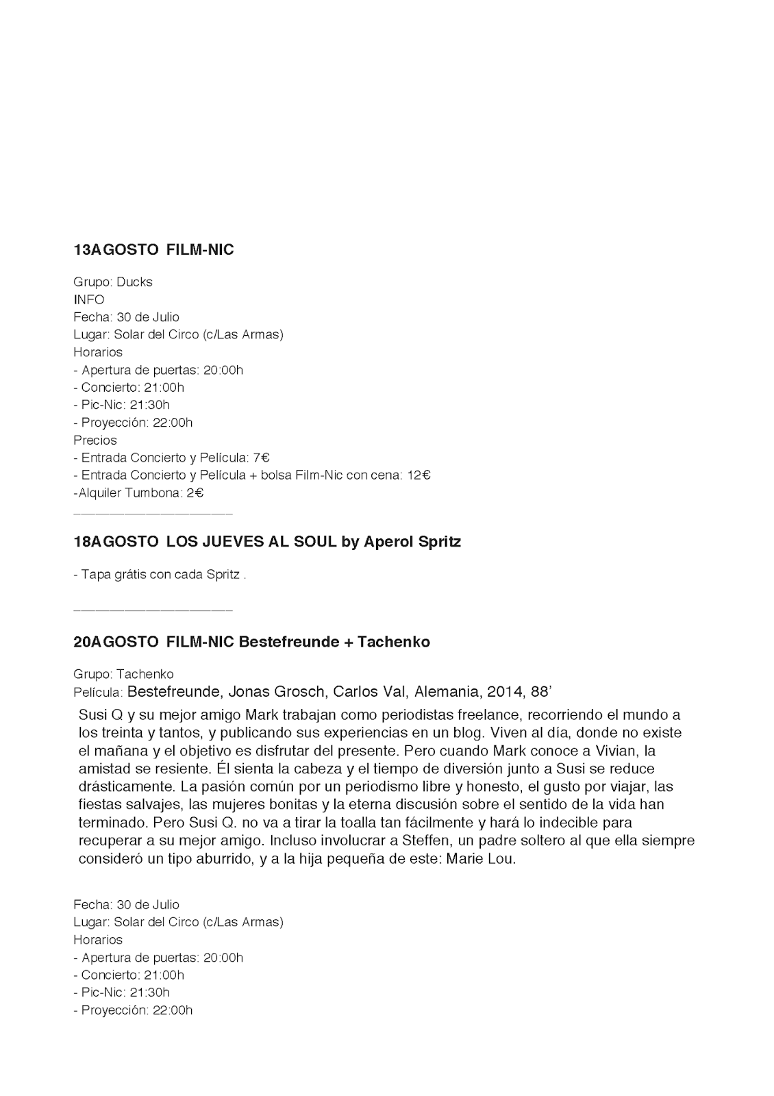 Todos los sábados de julio y agosto, a partir de las 20 horas y en Las Armas –Solar del Circo, calle Las Armas-, cine de verano al aire libre con proyecciones, conciertos y pic-nic.