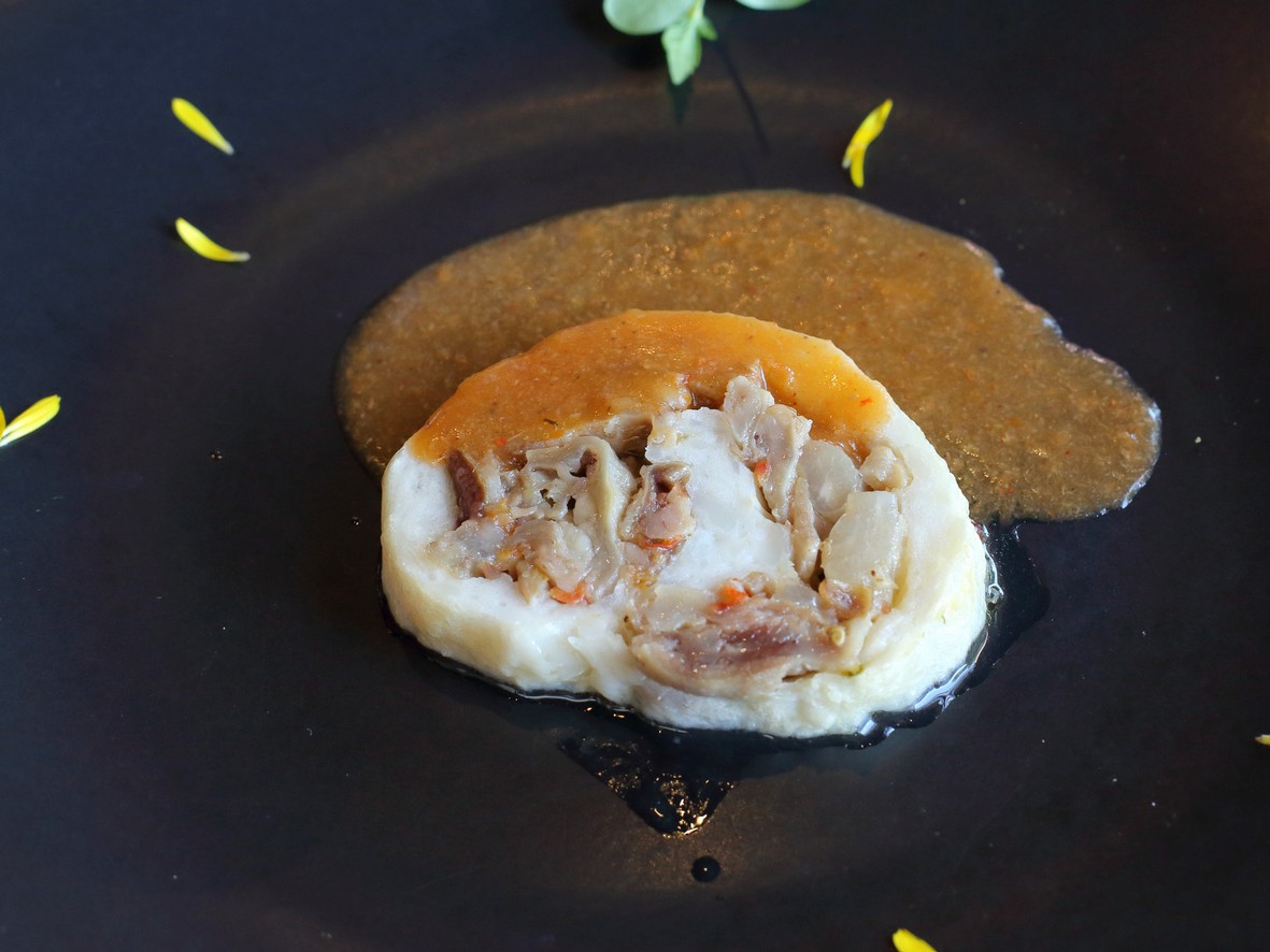 Sepia rellena de manitas y salsa de arroz con mariscos