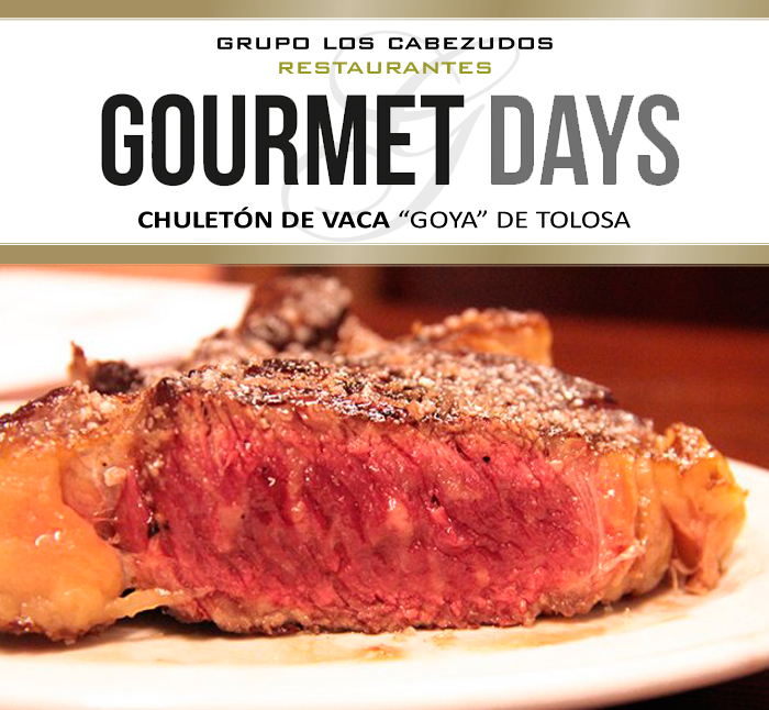 En Los Cabezudos –Antonio Agustín, 12-14. Zaragoza. 976 392 732– y Tragantúa −Pl. Santa Marta, s/n. Zaragoza. 976 299 174–, GOURMETS DAYS. Del miércoles, 19, al sábado, 22, Semana del chuletón de vaca Goya, de Tolosa, a 25 euros el kilo.