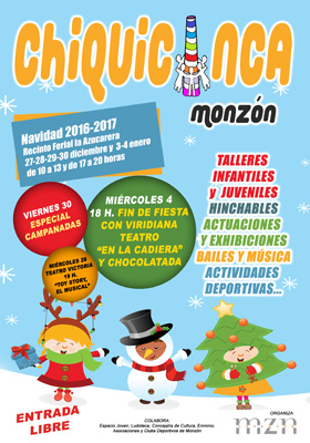 El parque infantil navideño de Monzón Chiquicinca ocupa la Nave de la Azucarera los días 27, 28, 29 y 30 de diciembre y 3 y 4 de enero, con horario de diez a una y de cinco a ocho, con entrada gratuita.