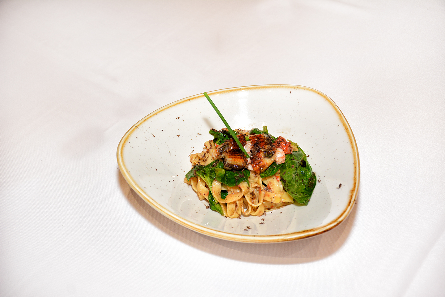 Fetuccini salteados de Espinacas, tomate confitado y gambas con ralladura de Trufa Negra y anguila ahumada. Con Sommos Colección Merlot (Tinto).