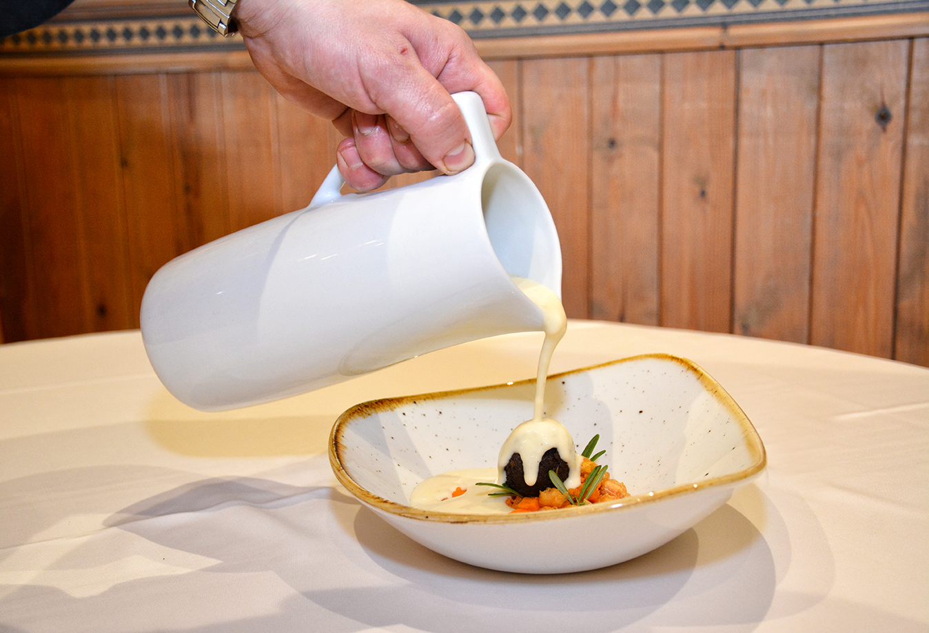 Crema de Chirivías asadas con falsa Trufa de morcilla, dados de boniato y crujiente de garbanzos. Con Glarima Variertales Magnum (Tinto).