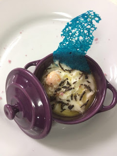 Puré de patata trufado, pulpo., yema de huevo y helado de mango con virutas de trufa