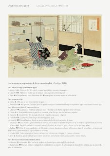 En él, además de presentar algunas piezas de Tanzan Kotoge pensadas para su uso en esta delicada manifestación artística, se presentan diversos instrumentos necesarios para la realización de la misma. Esta sección se completa con varias estampas y un álbum de xilografía japonesa de la escuela ukiyo-e que nos ilustran cada una de las etapas de esta ceremonia, los utensilios utilizados y la estética que la rodea.