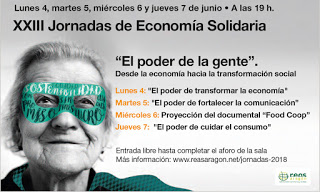 Del lunes, 4, al jueves, 7, XXIII Jornadas de EconomíaSolidaria “El poder de la gente” en el Centro Joaquín Roncal –calle San Braulio, 5. Zaragoza-. Consulte aquí el programa completo de charlas y talleres.