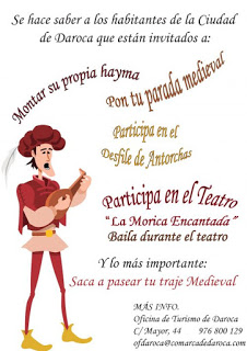 «Un año más Daroca se llenará este fin de semana de músicos, recreacionistas, juglares y artesanos para celebrar la XIX Feria Medieval. Durante los tres días la calle Mayor se engalana con pendones y toldos, además de una gran variedad de puestos de artesanía y alimentación. También durante estos días se podrá disfrutar de La batalla de los dos Pedros, la representación de la leyenda de ” La morica encantada” y la del “Milagro de los Corporales”.»