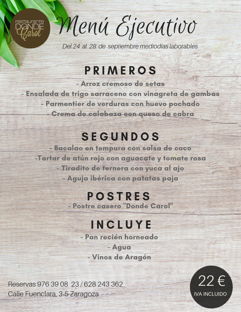 El restaurante Donde Carol –Fuenclara, 3-5. Zaragoza. 976 390 823–propone su menú ejecutivo, de lunes a viernes al mediodía, por 22 euros, con tres opciones por servicio y postre casero. Incluye pan recién horneado, agua y vino de Aragón. Reservas en 976 390 823 y 628 243 362.