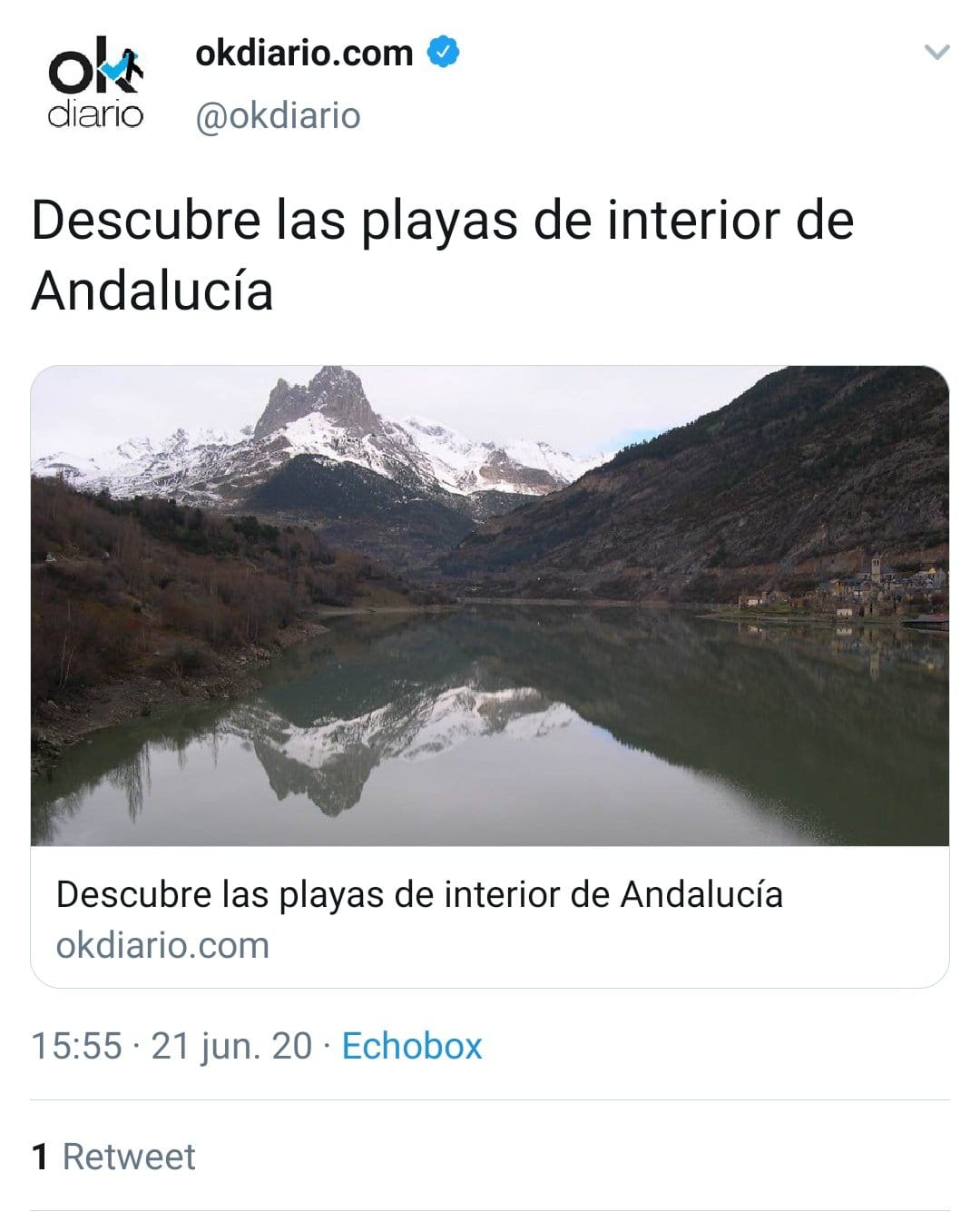No es Ok Diario un medio al que este tapao tenga en mucha estima, especialmente por su interés en inventarse determinadas noticias. Algunas cuelna, pero ubicar el pantano de Lanuza en Andalucía parece demasiado. En el artículo titulado Descubre las playas del interior de Andalucía aparece la imagen superior –también en un tweet, que hay que optimizar la información–, cuyo pie de foto es el del titular, por si acaso. Si verifican así lo publican, como para creerse el resto…