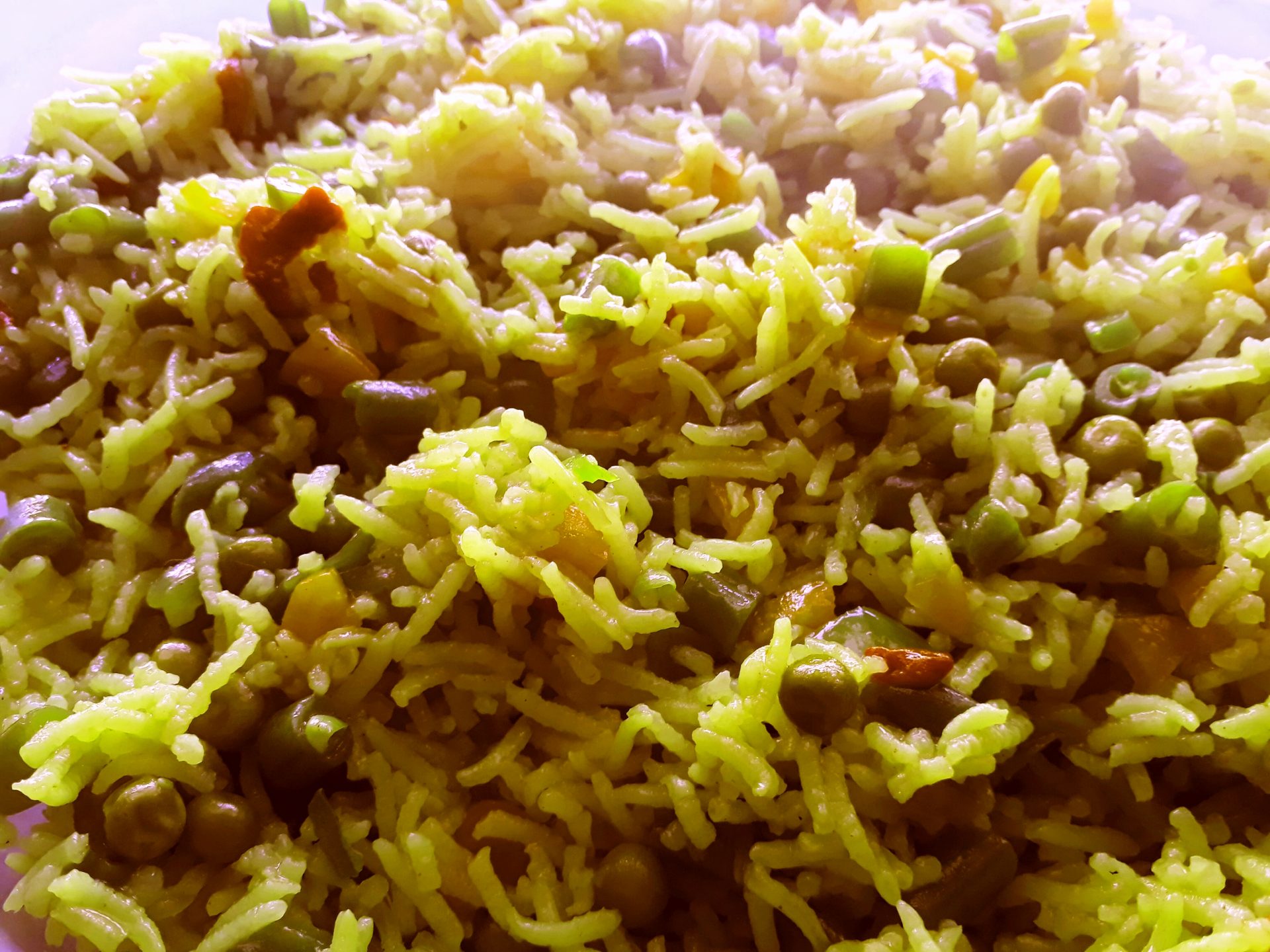 Biryani vegetariano. Obsérvese la ligera incurvación de los granos de arroz basmati y sus extremos, netos, no abiertos.. FOTO: F. Abad. A.