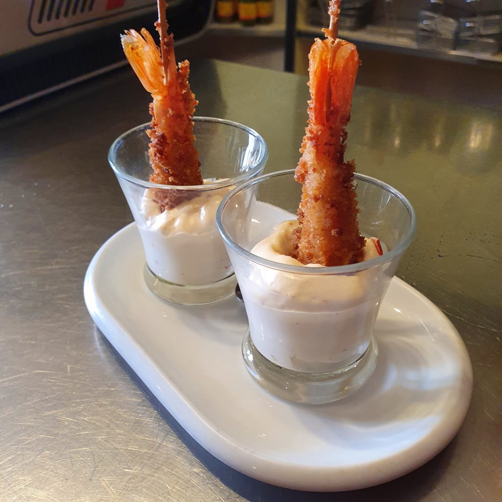 Puede que te pierdas, puede que no llegues, pero en Boca Boca –Virginia Woolf, 5. 50018 Zaragoza. 624 600 134– te están esperando con unas sonrisas de lado a lado. Es un bar chiquitico, con una muy amplia terraza peatonal que los vecinos, adictos a sus elaboraciones la van rotando. Pero hemos venido a por su vasito de gamba, tan cuqui él; en su vasito de carajillo tan castizo él; nos encanta. Fiamma & Boris montan una mahonesa con chile chipotle para darle un poco de rasmia y una gamba rebozada en panko para el crujir del personal. Gusta, en un momento volaron unos cuantos. Nos dicen que han abierto un bar nuevo por el centro, suerte criaturas que está la cosa mu mal.