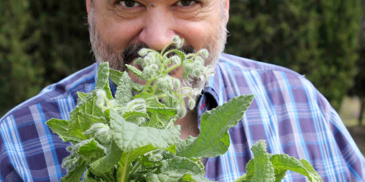 Miguel Ángel Revuelto, escondido tras una mata florecida de borraja. Foto: Archivo Gastro Aragón.