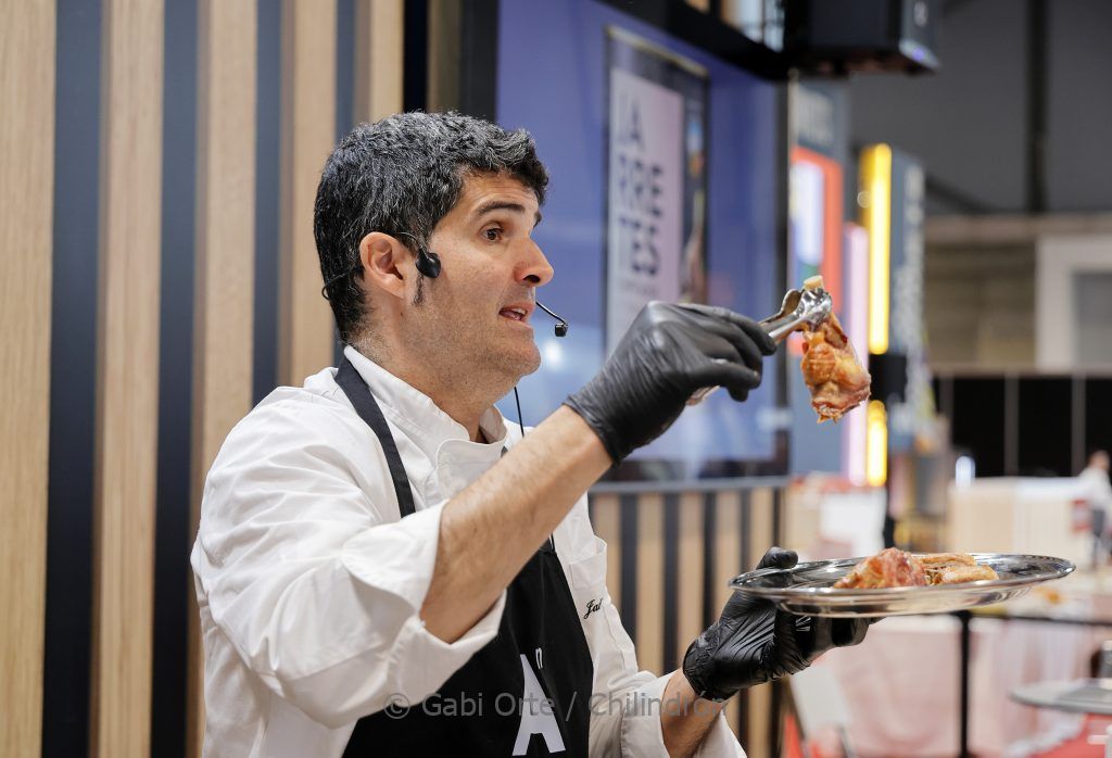 Javier Robles muestra, en el Salón Gourmets, cómo terminar estas conservas de ternasco. Foto: Gabi Orte Chilindrón.