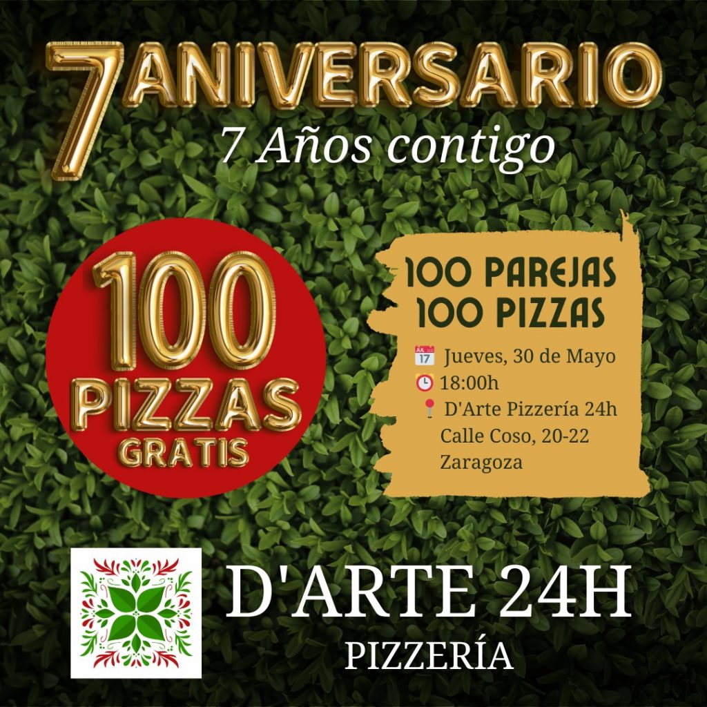 El grupo hostelero D´arte Obrador & Pizzería celebra este jueves 30 de mayo su 7º aniversario en Zaragoza, regalando 100 pizzas a las 100 primeras parejas que se acerquen a su cajero automático ubicado el la calle Coso 20-22.